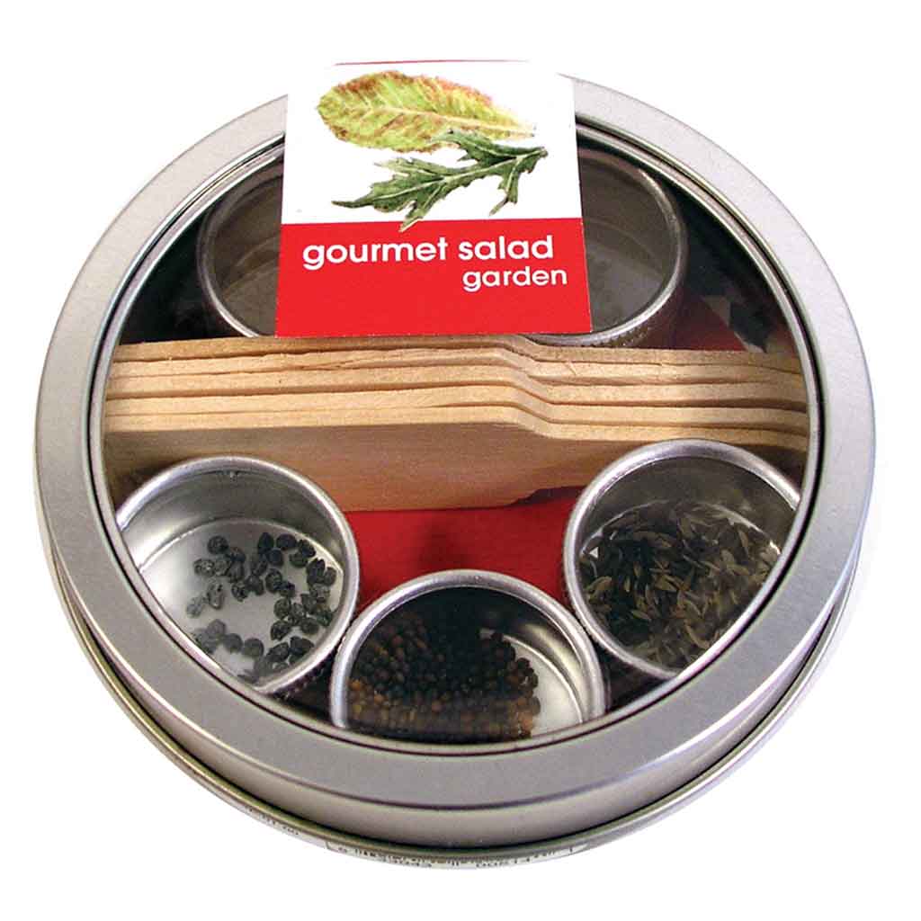 Gourmet Salad contains: 5 varieties of seed (Deep Purple Bunching Onions, Spicy Greens Mix, Pencil Carrot, Gourmet Lettuce Mix, Bite Size Tomato)