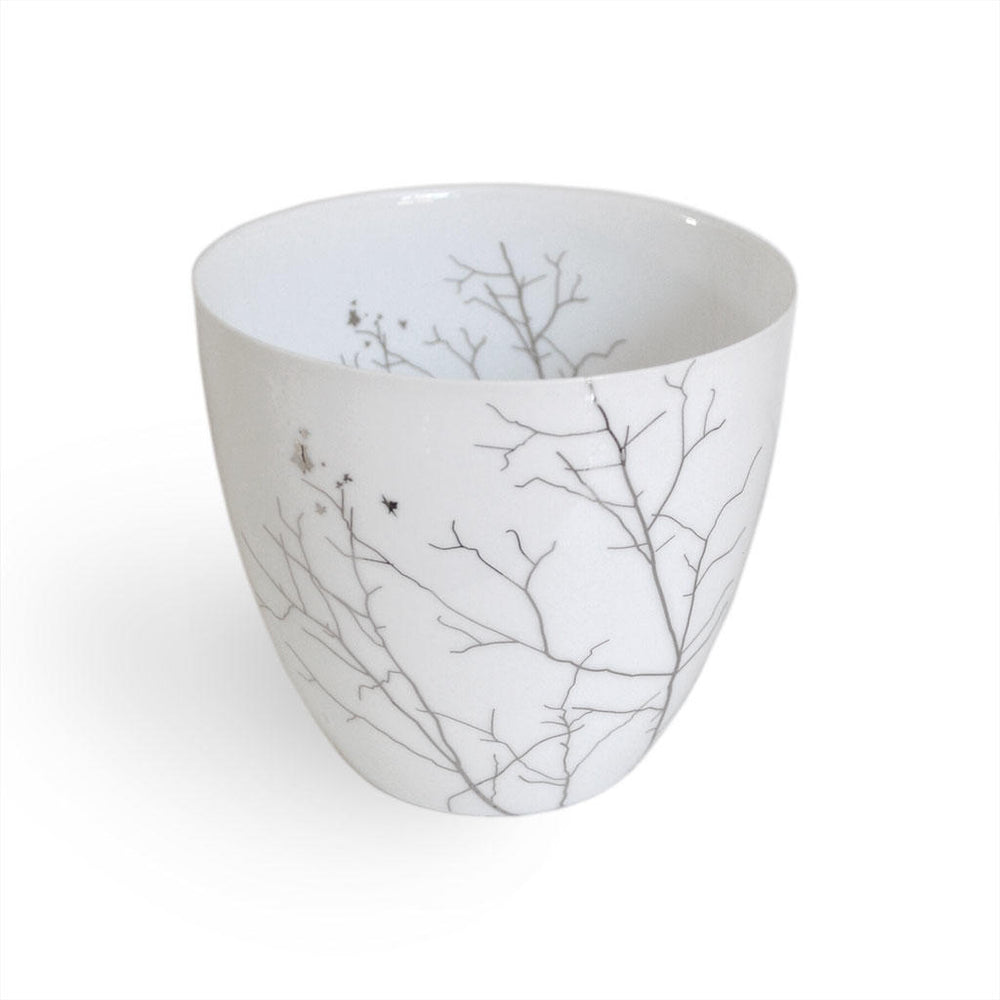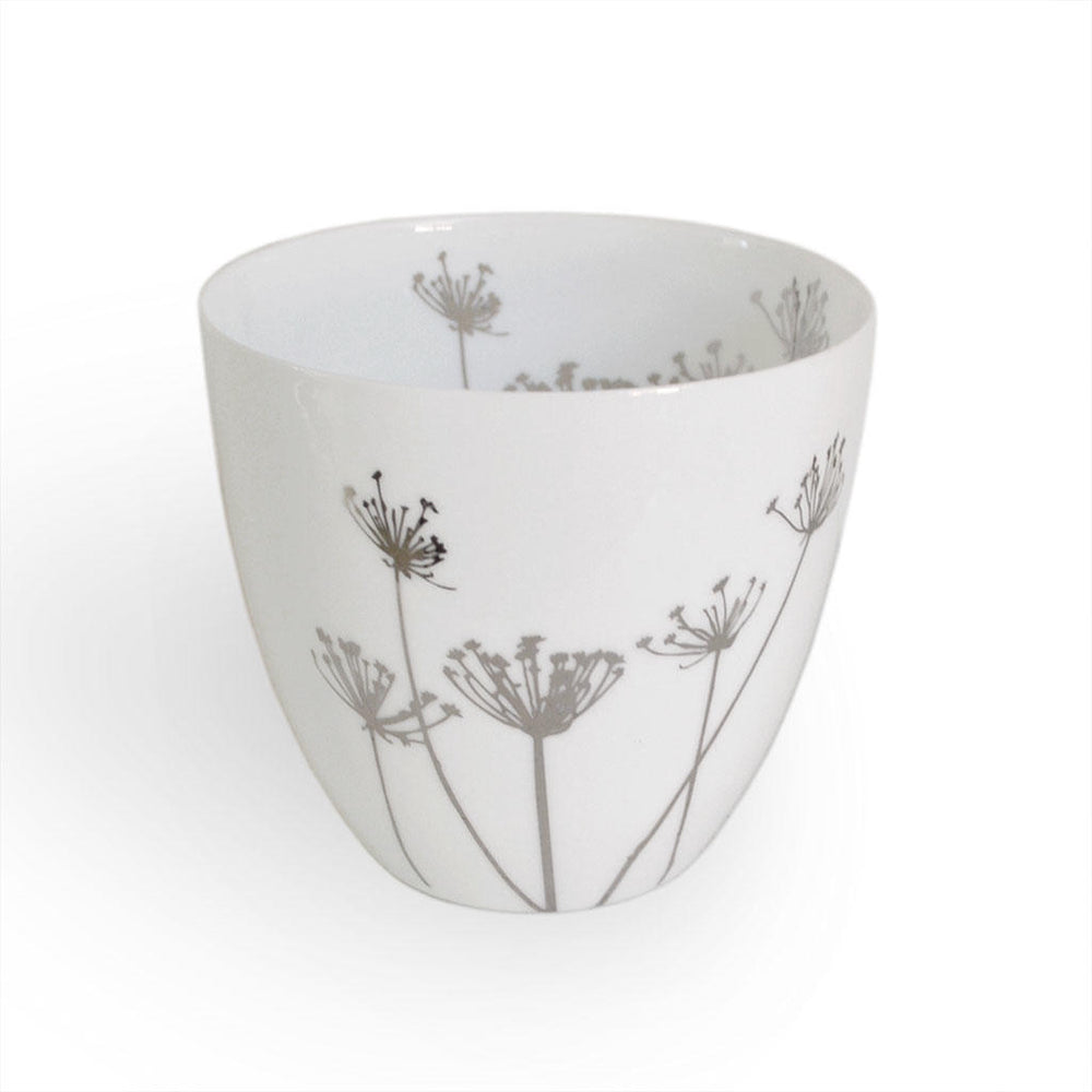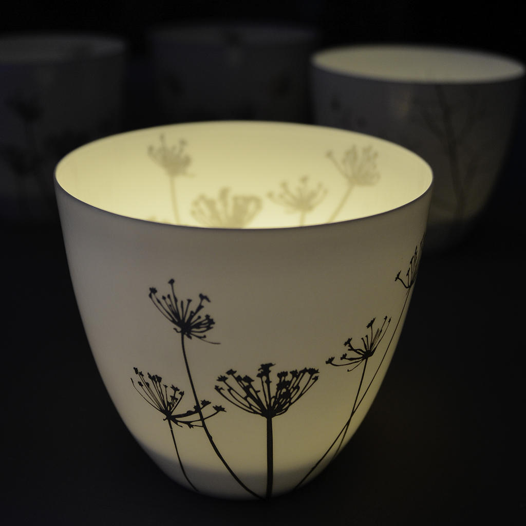 These porcelain tea-light holders have delightful delicate whispy designs of seed heads and tree branches both outside and inside the holder.
