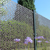 Abstract floral shapes with a geometrically-formal structure. The pattern has 65% opacity, and works particularly well when used against a wall and is back-lit. Perfect for screening and delineating outdoor spaces. Can also be used as a boundary fence.