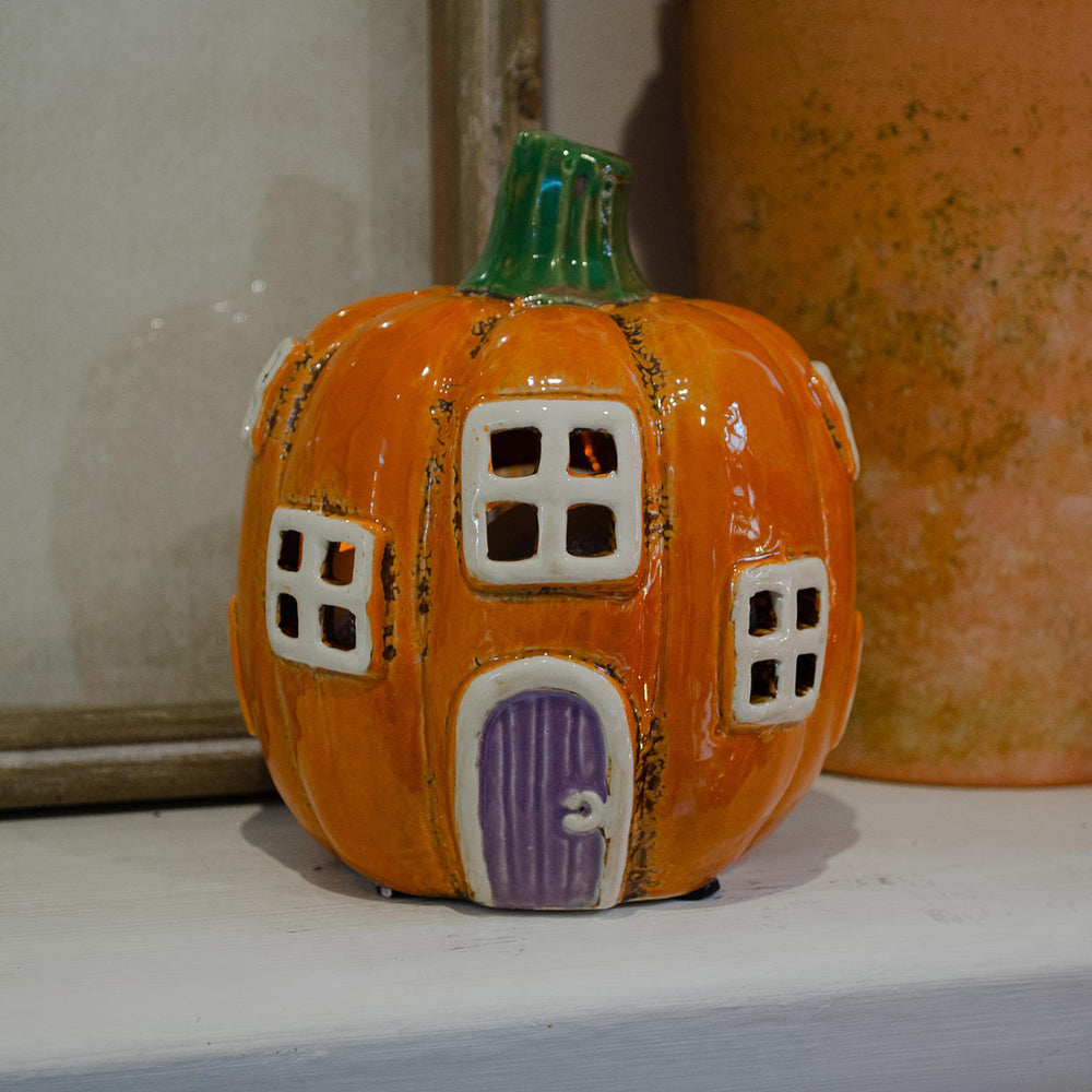 Step into the shadows with this eerie Ceramic Pumpkin House Lantern. Perfect for sending chills down the spine of any trick-or-treater who approaches.