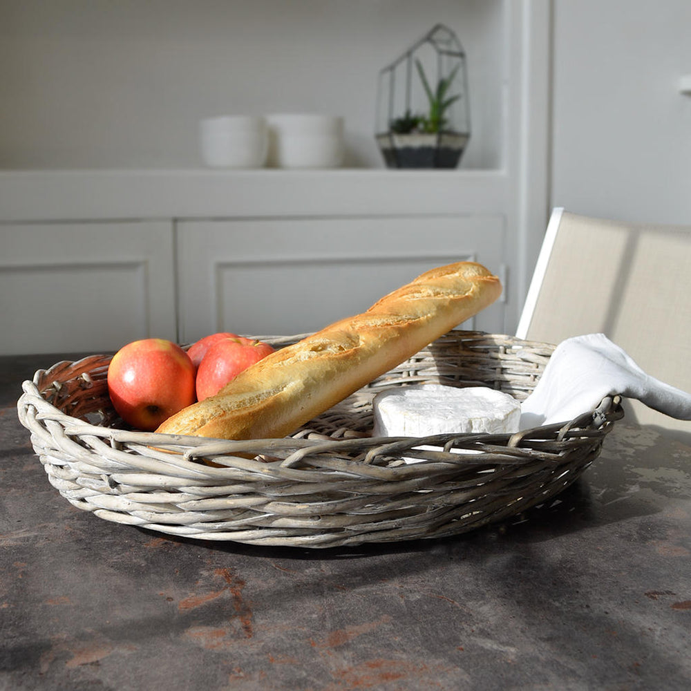 For alfresco entertaining or relaxed dining, this simple oval washed wicker serving tray is perfect for bread, cheese or breakfast pastries.