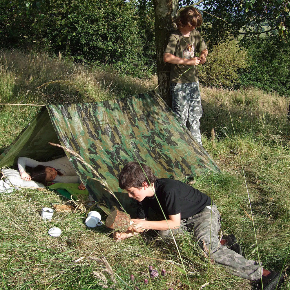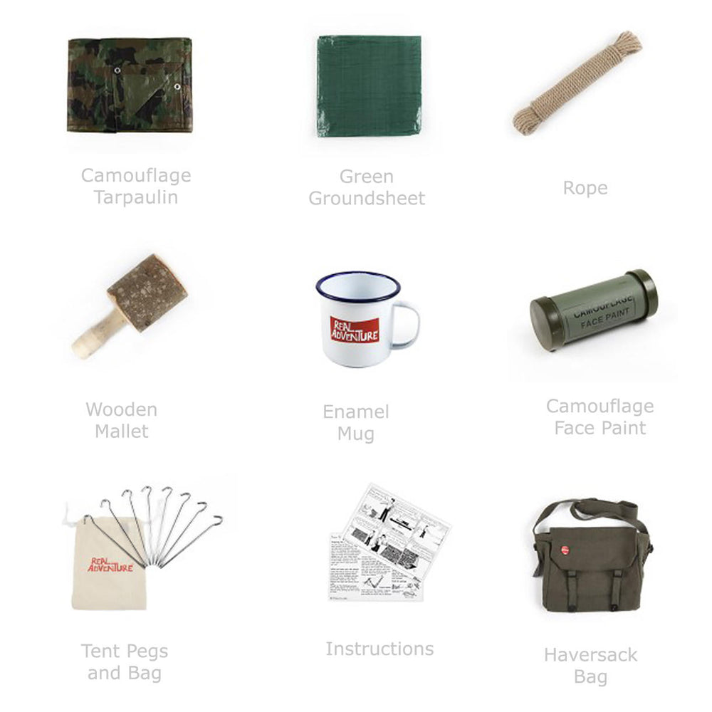 The kit includes a tough camouflage tarpaulin to create a roof and a groundsheet for the floor. Plus you get a unique mallet, tent pegs and rope to put the den together plus a enamel mug and facepaint to complete the look. The rest is up to their imagination.