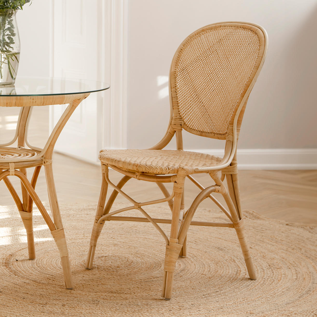 The Rossini chair is made of natural material and the seat and back are handwoven on a frame of rattan.