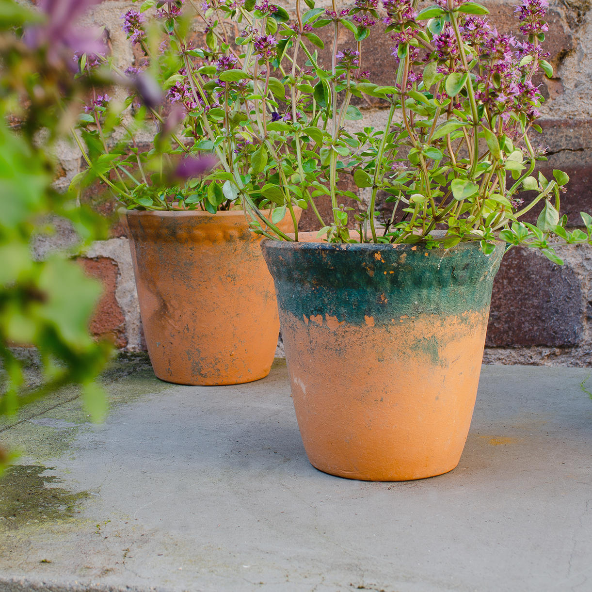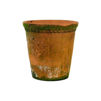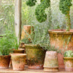 This cute little terracotta plant pot has a rustic vintage patina in green moss is ideal for for holding window sill herbs or patio plants.