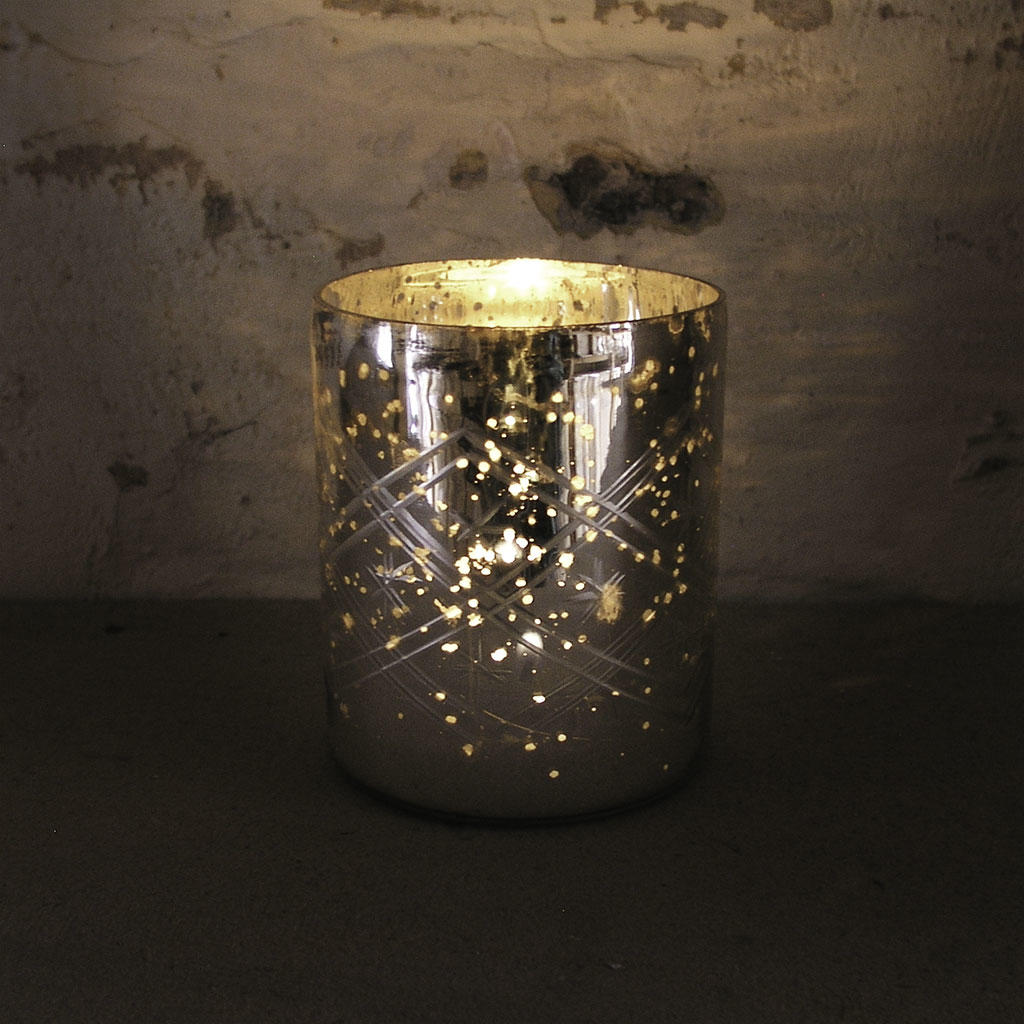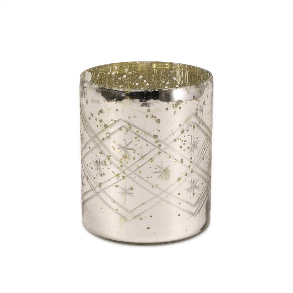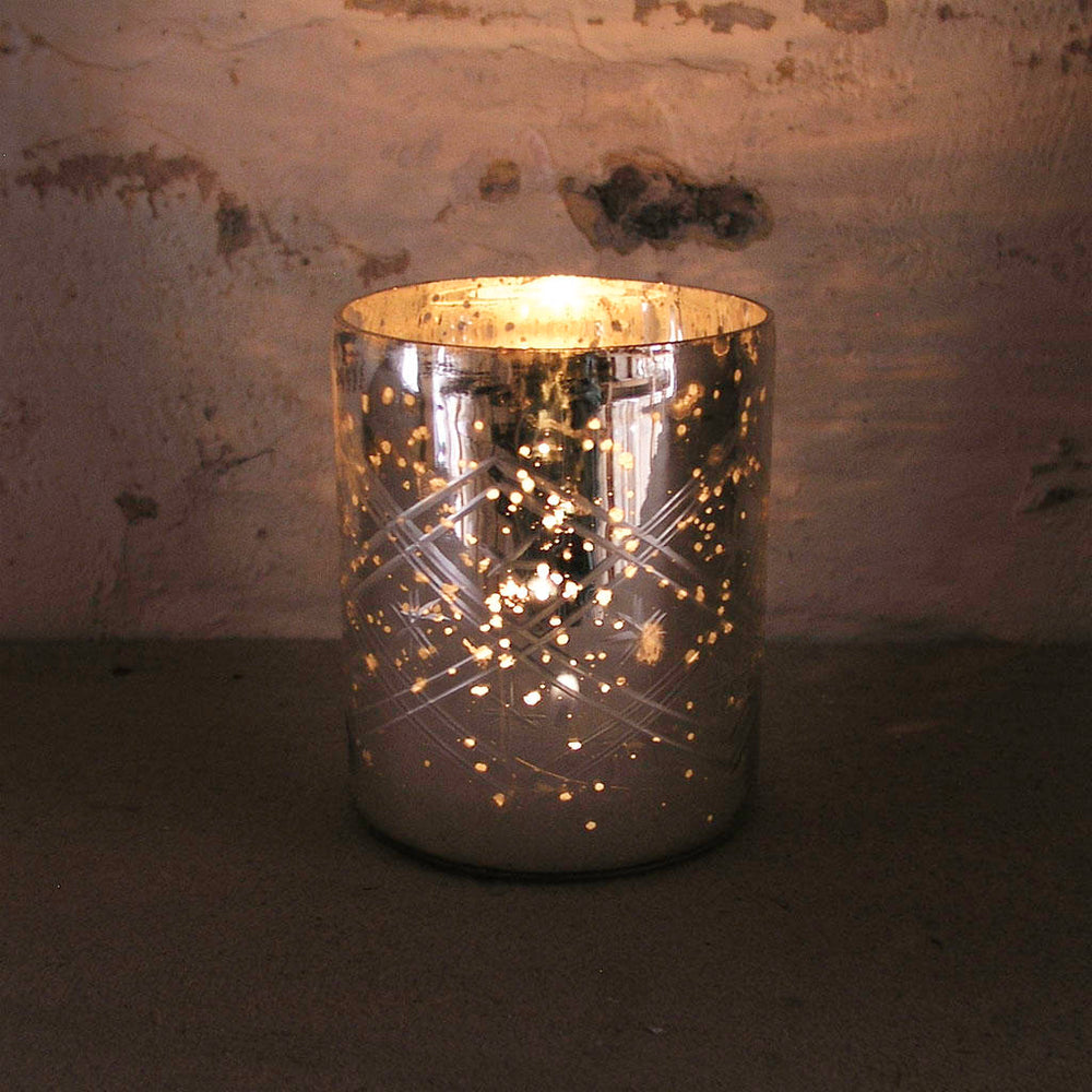Pretty glass tea-light holder in etched glass in rustic silver finish.