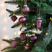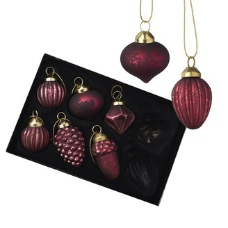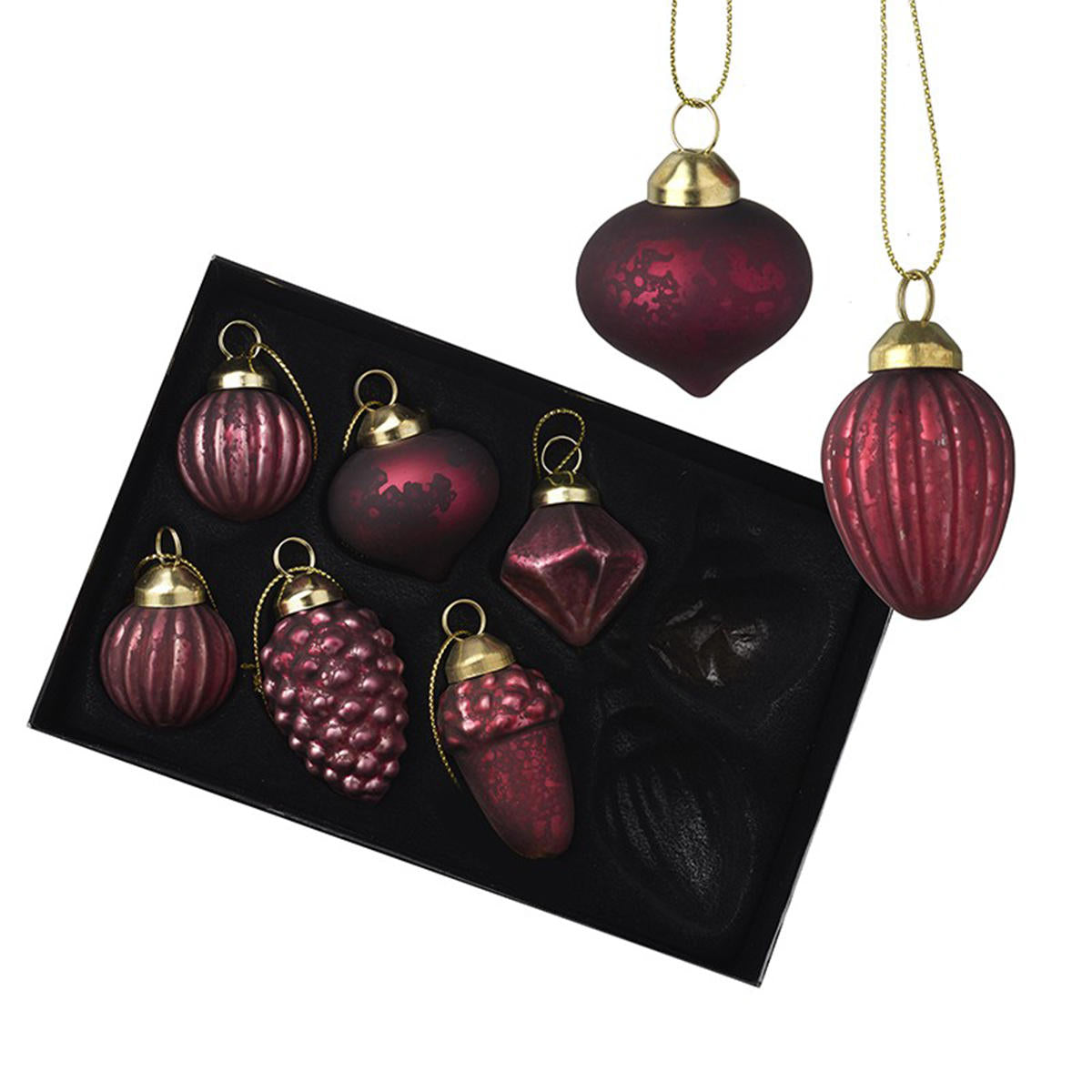 A delightful collection of 8 mini glass mulberry coloured baubles in different shapes.