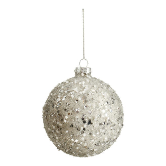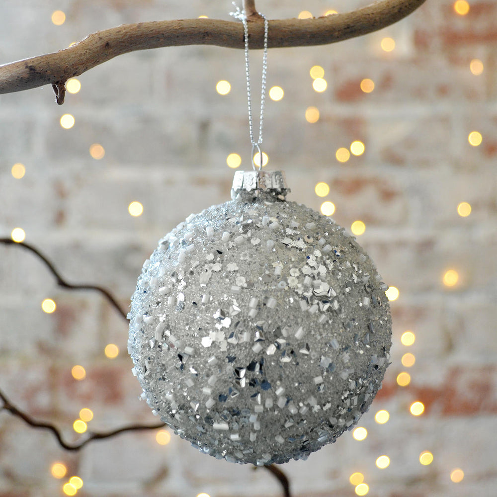Our classic silver glass bauble decoration, with beaded confetti effect, looks stunning amongst green foliage for a sparkly and elegant Christmas tree.
