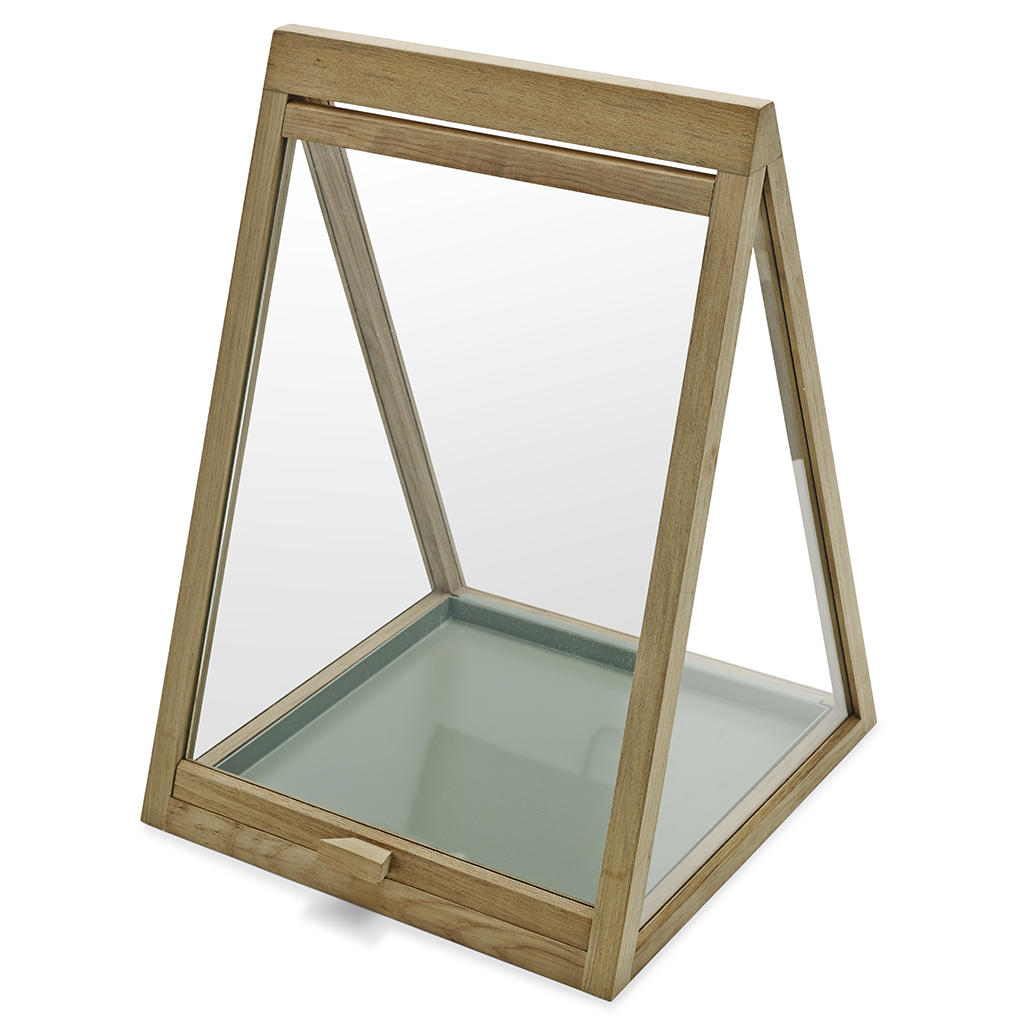The triangular shaped greenhouse has glass sides and a steel hinged lid for easy access.