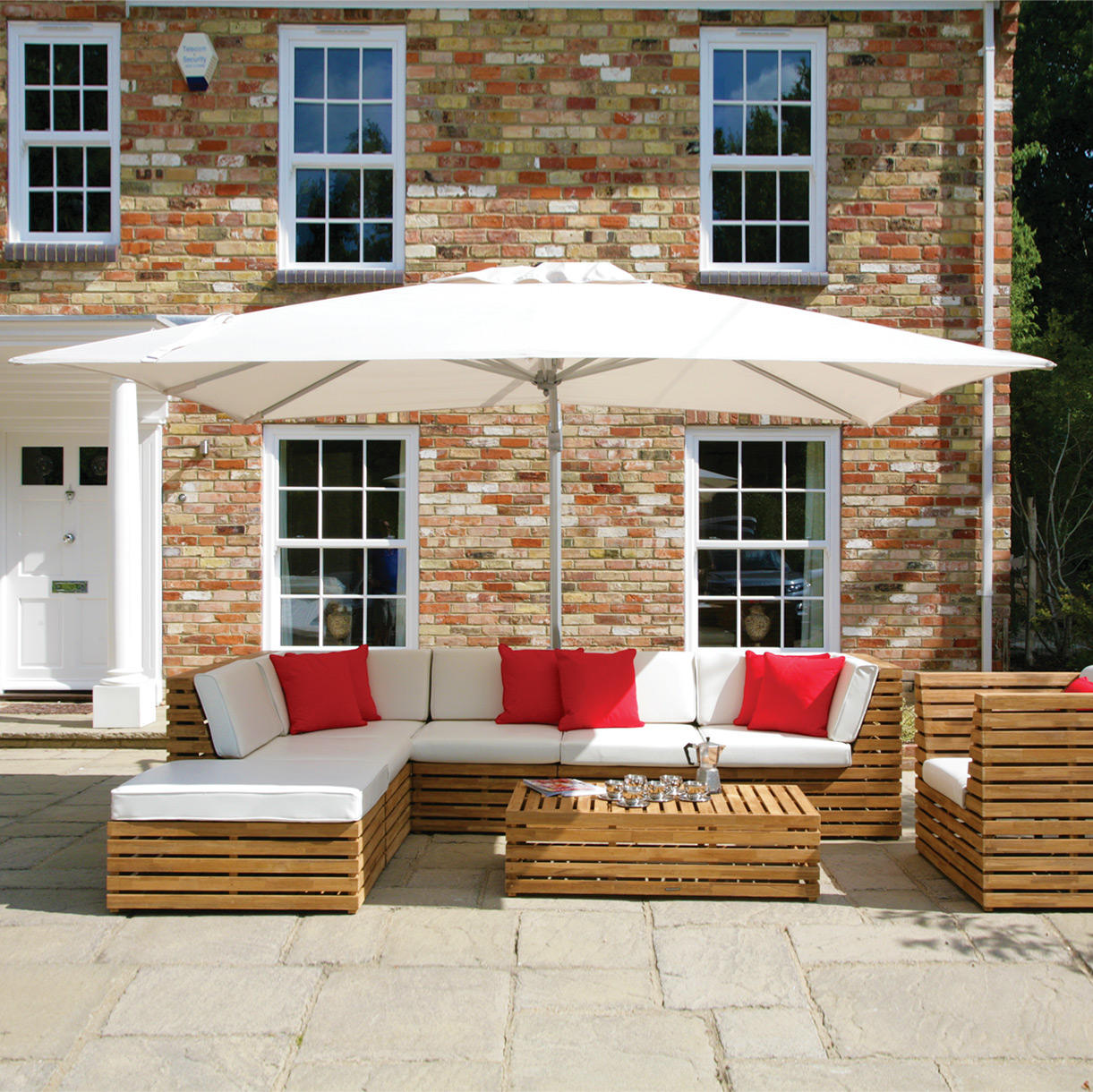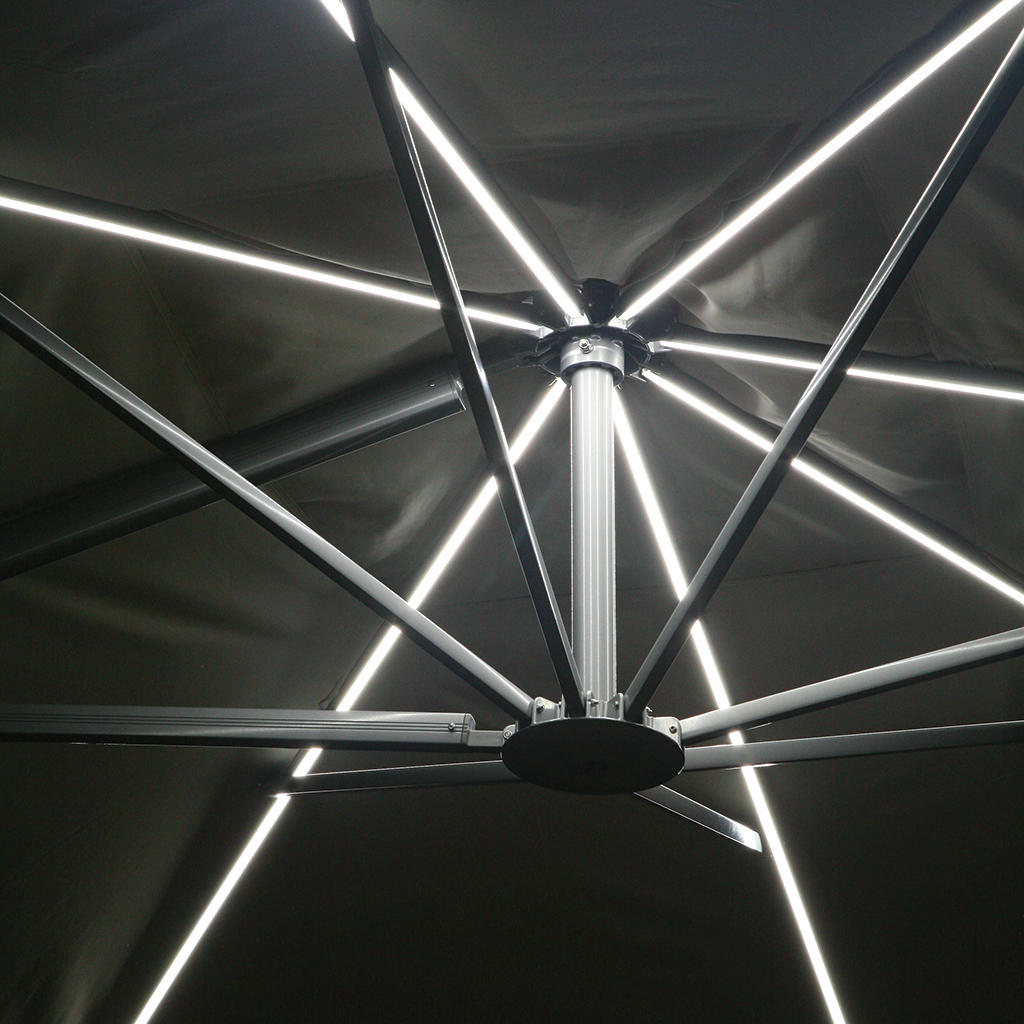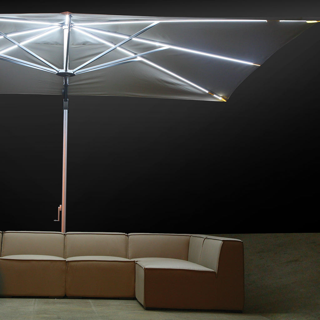 Sunrise Cantilever parasols are a large sturdy, easy to use parasol complete with LED lights within the frame controlled remotely.