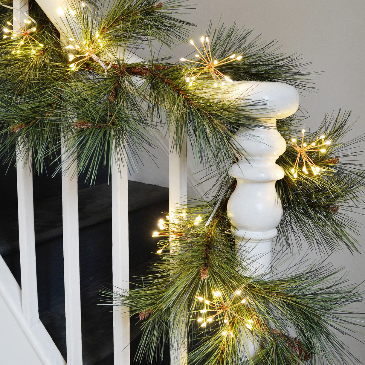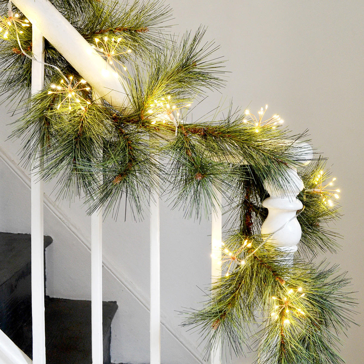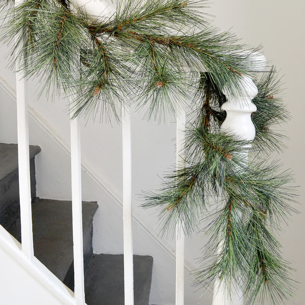 This simple green pine needle garland is a great base to use on your banisters, mantelpieces etc.
