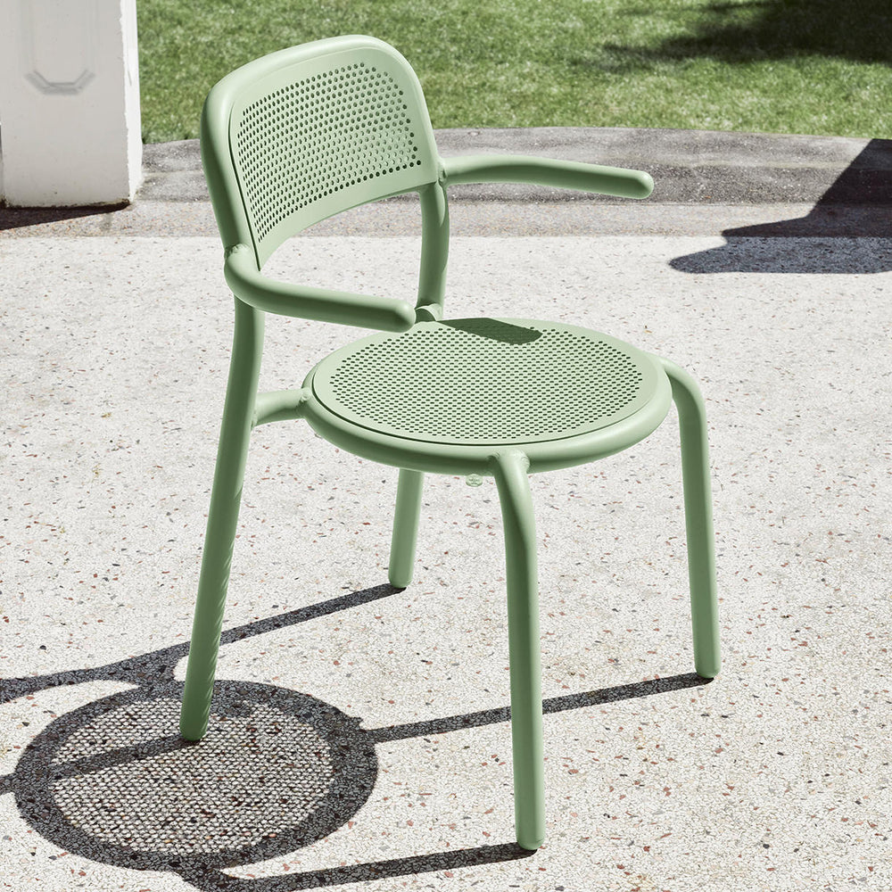 Fabricated from lightweight aluminum, these Toni chairs can easily be stacked.