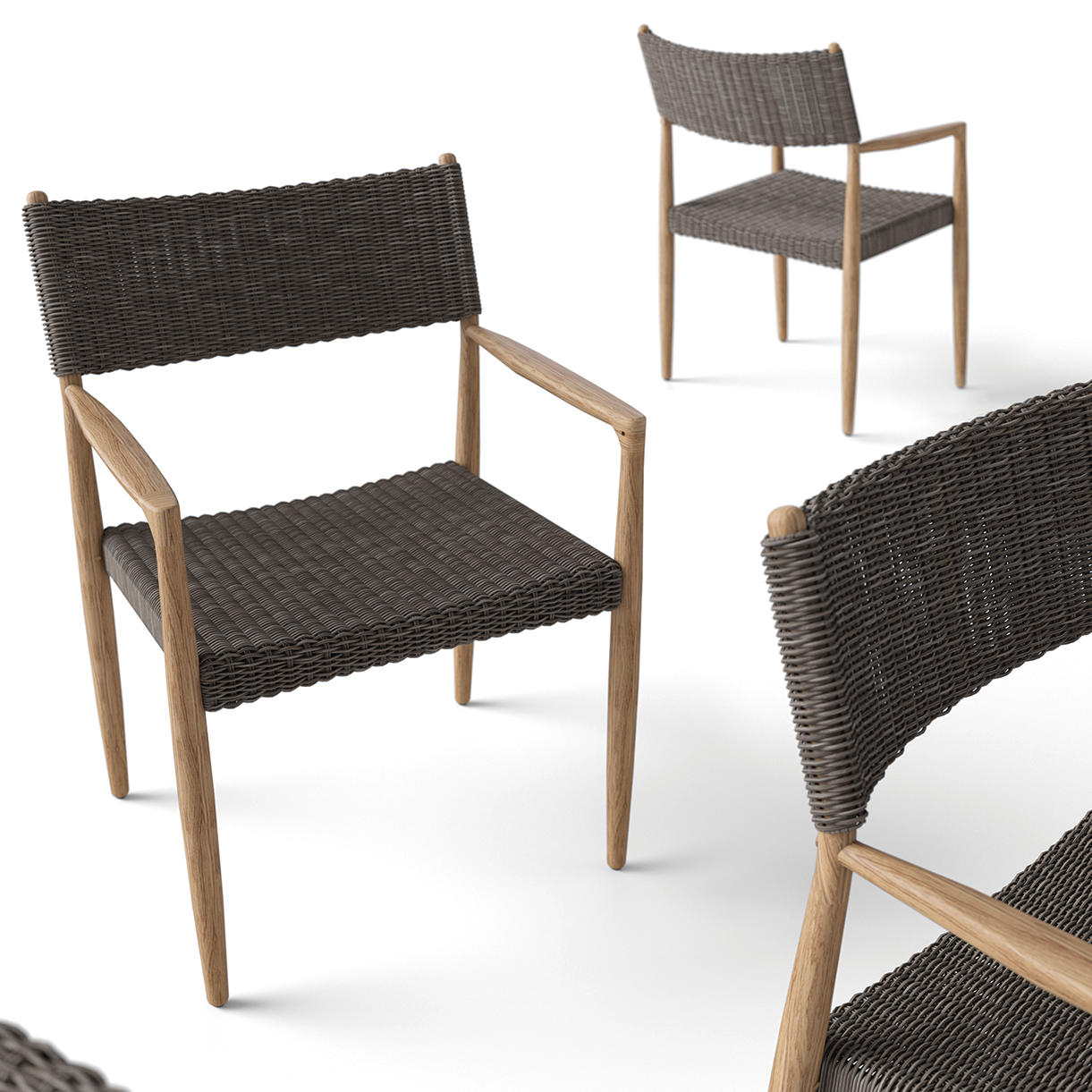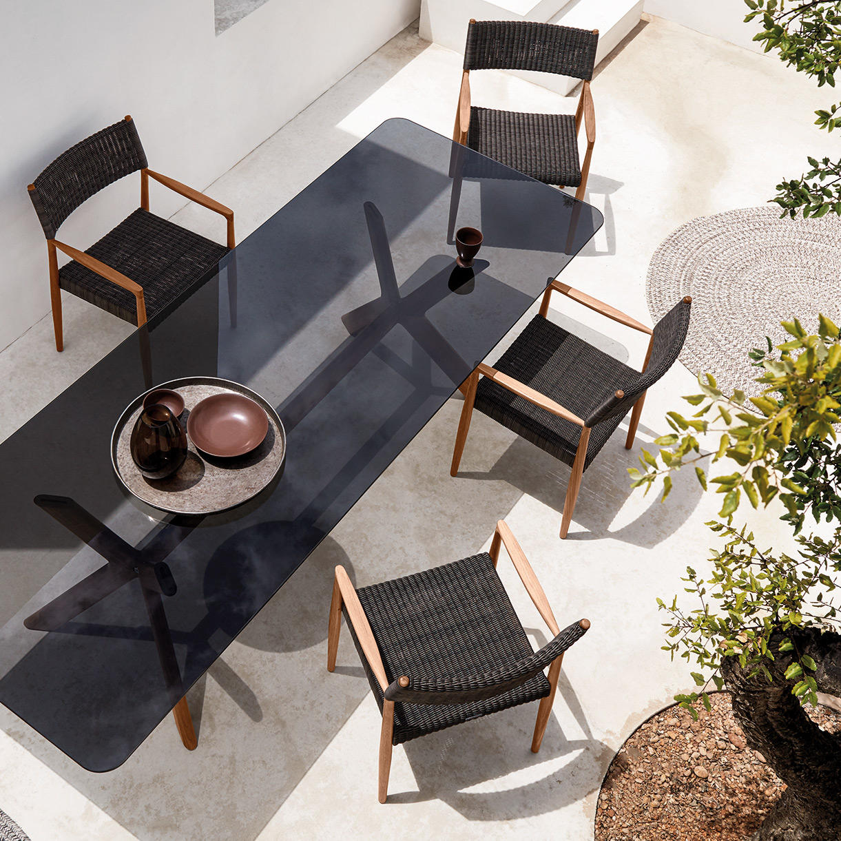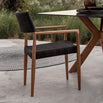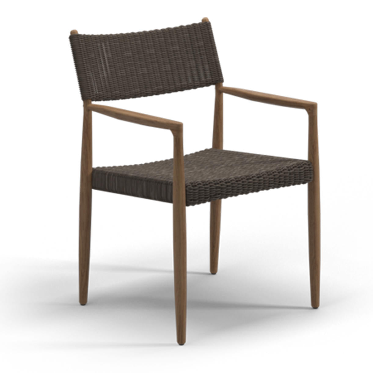 Comfortable and elegant, the Tundra dining chair with arms is made from natural teak, with all weather outdoor wicker seat and back