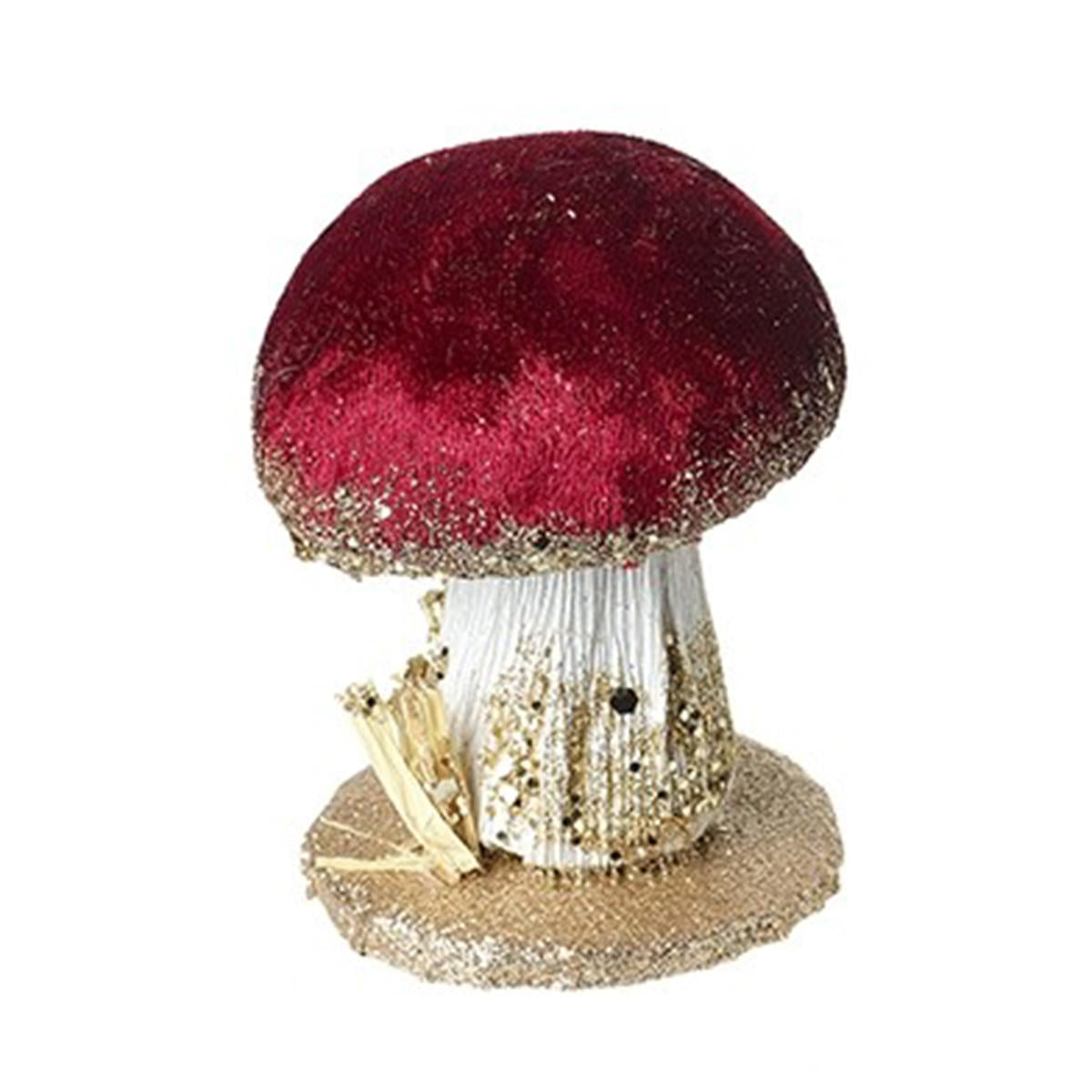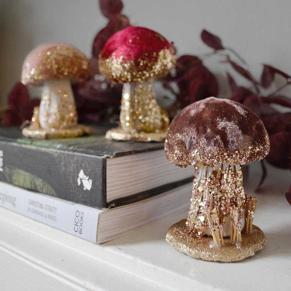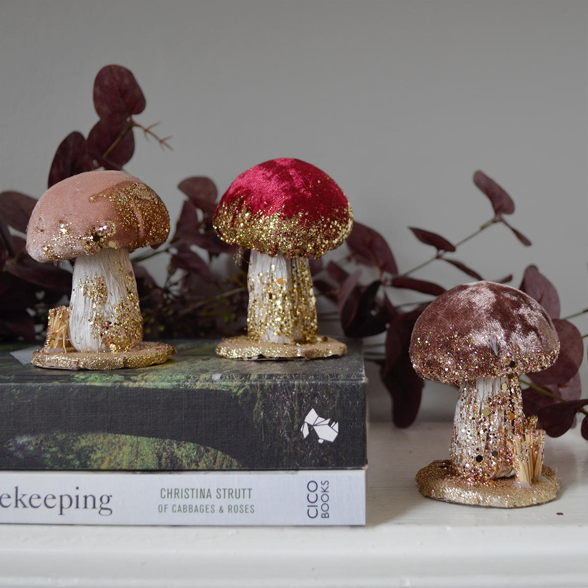 These velvet mushrooms in gorgeous Autumnal tones, dusted with glitz and sparkle, look gorgeous on a mantlepiece or window sill.