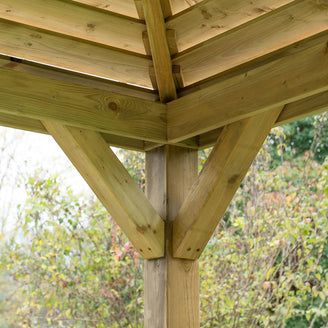 Grow trailing plants, such as clematis or honeysuckles, around the supporting pillars to give softer edges.