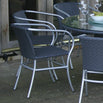 An outdoor dining chair with a striking curvaceous powder coated aluminium frame woven in an all weather synthetic weave, so is suitable to be left outside in all weathers.