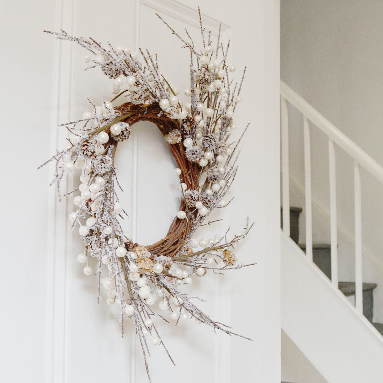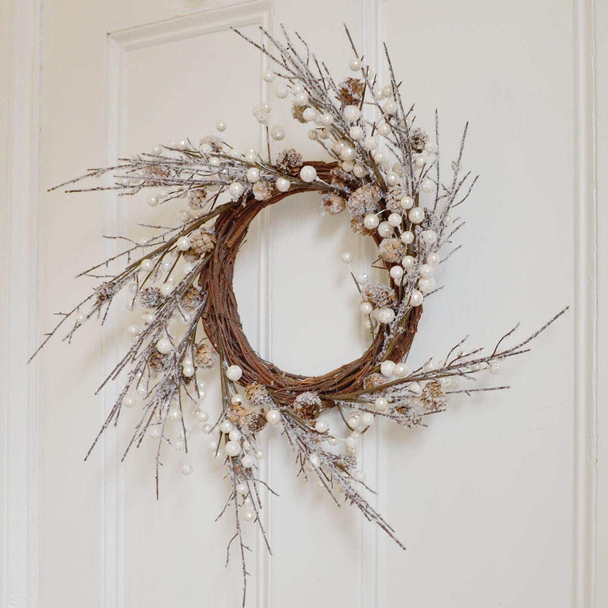 Delightful wreath decorated with natural cones and pearl berries, and with a dusting of faux snow.