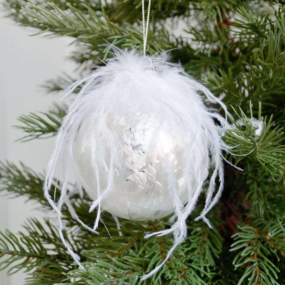 Elegant white glass bauble with frosted detail and soft white feathers will make a simple but gorgeous statement.
